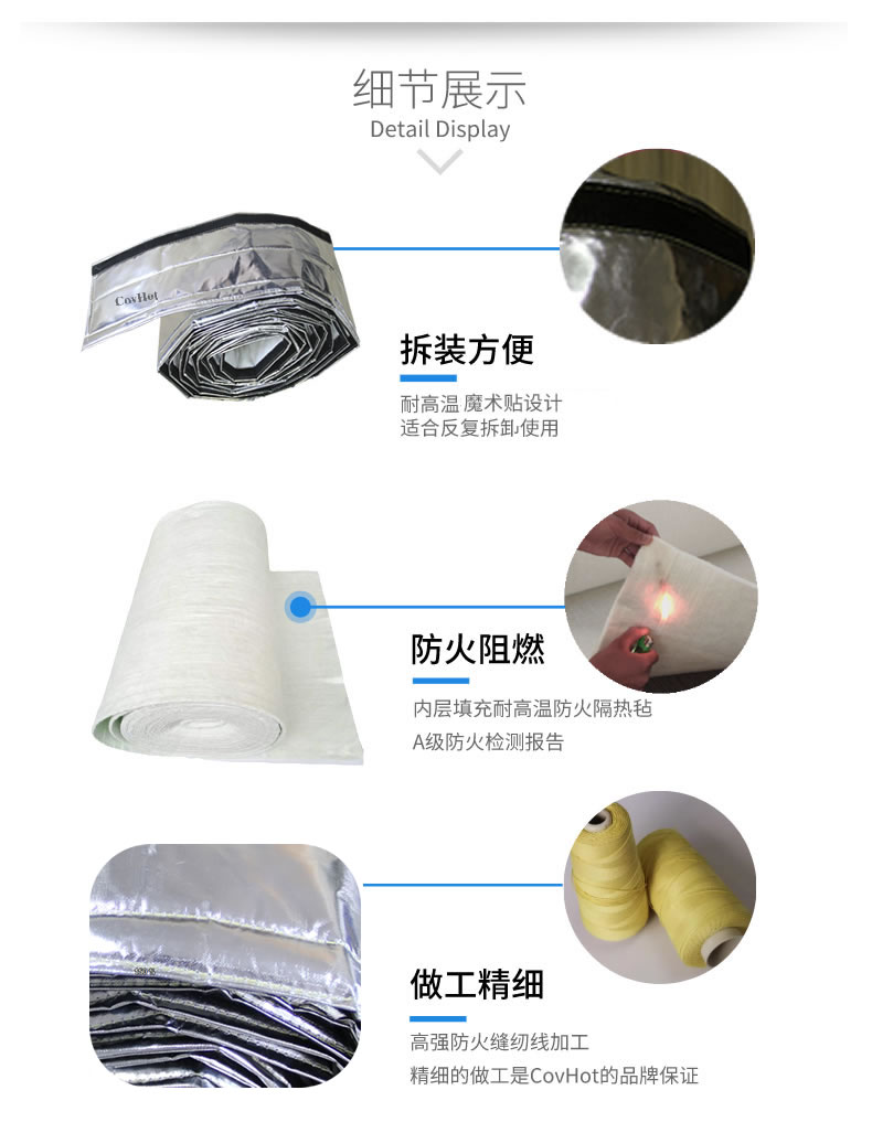 Covhot自粘式保溫帶產品作為方便拆卸的保溫隔熱產品,具有耐高溫、導熱系數低、耐酸堿、防火阻燃能力。