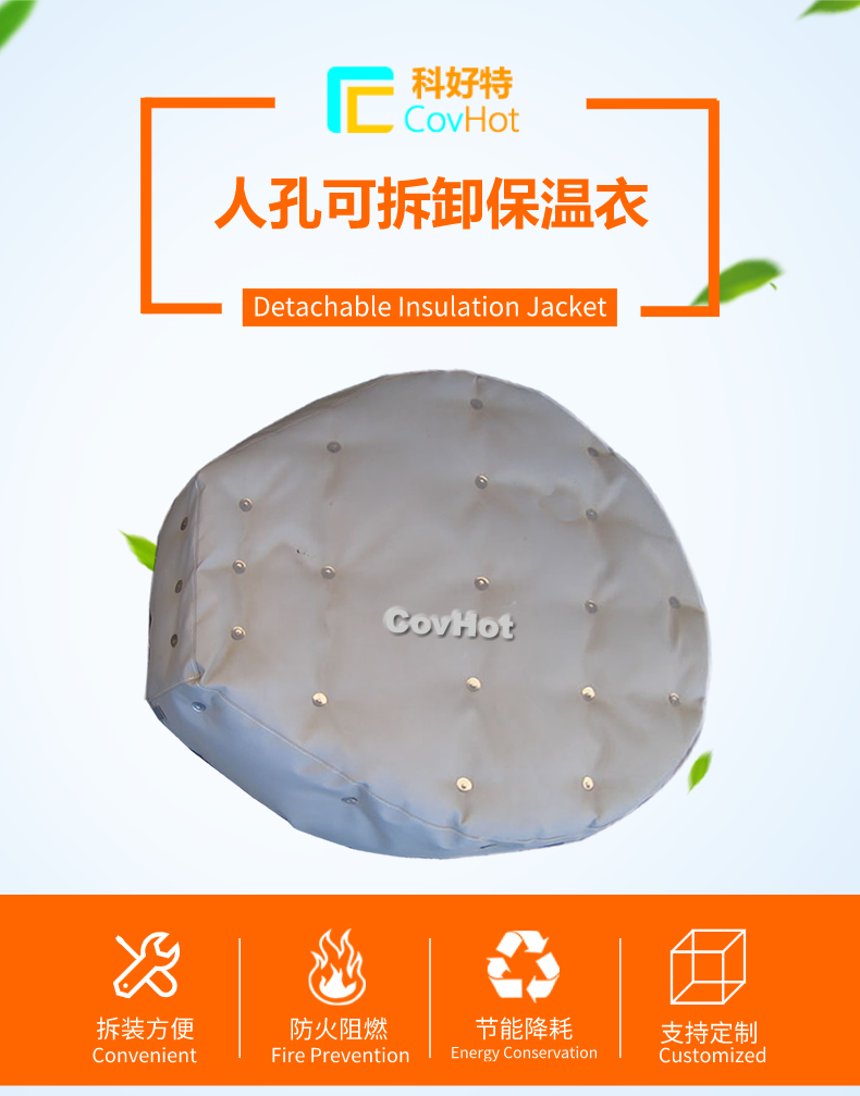 柔性可拆卸人孔保溫隔熱套可以很好的解決以上問題,產品耐高溫可達550℃,保溫隔熱效果好,可以很方便的進行人孔設備拆裝,方便清洗和維護,表面采用可擦洗材料,防水防油,耐腐蝕??梢苑磸筒鹧b使用。是工業進行人孔保溫的理想產品。